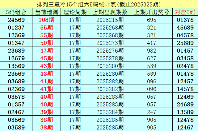 (1)目前排列三5码组六遗漏期数最大的组合为:24569,目前轮空108期;