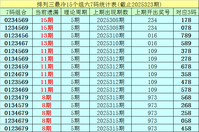 (1)在排列三已开出的7447期奖号中(统计截止第2025323期),目前7码组六遗漏值最大的组合为:0234569、1234569,本期遗漏15期;